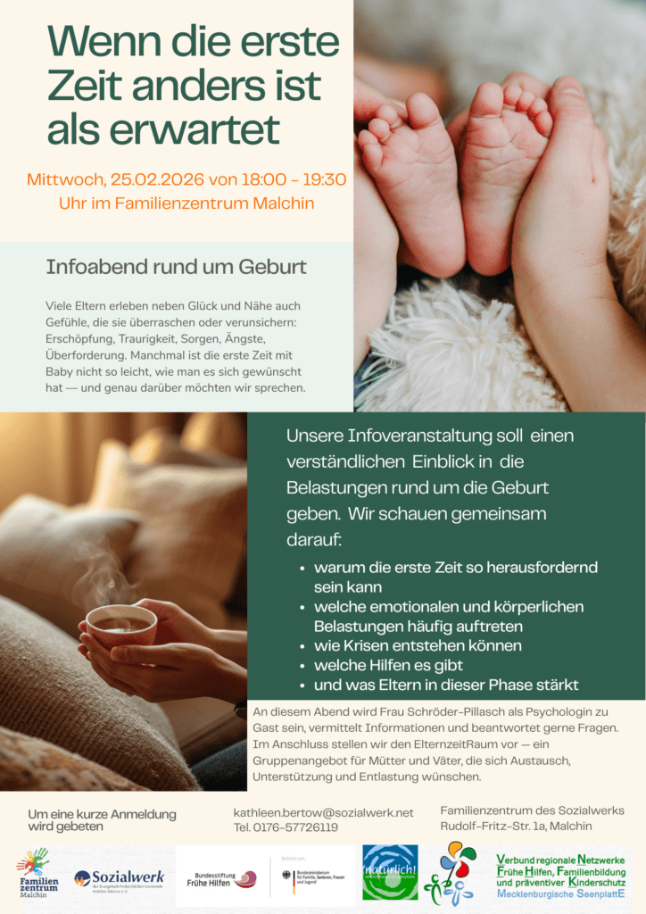 Viele Eltern erleben neben Glück und Nähe auch Gefühle, die sie überraschen oder verunsichern: Erschöpfung, Traurigkeit, Sorgen, Ängste, Überforderung. Manchmal ist die erste Zeit mit Baby nicht so leicht, wie man es sich gewünscht hat — und genau darüber möchten wir sprechen. Der Elterntreff „ElternZeitraum“ ist ein offenes Gruppenangebot für Eltern, die nach der Geburt ihres Kindes unter psychischen Belastungen wie postpartaler Depression, Angstzuständen oder Erschöpfung leiden. Hier soll es einen Raum zur Begegnung, Austausch und Ermutigung geben. Eine erste Informationsveranstaltung findet am 25.02.2026 in der Zeit von 18.00 – 19.30 Uhr in den Räumlichkeiten des Sozialwerks in Malchin statt, Rudolf-Fritz-Str. 1a.